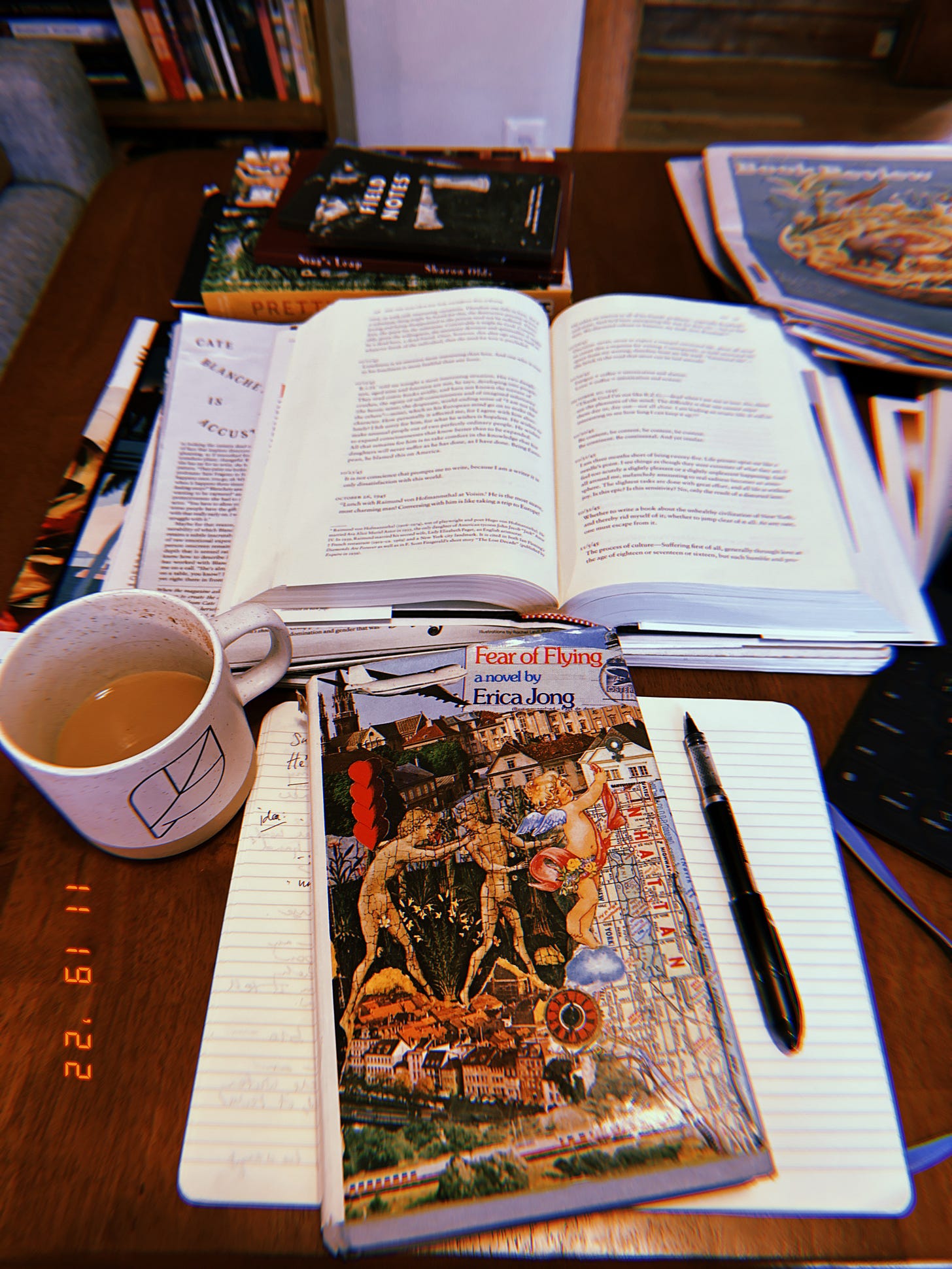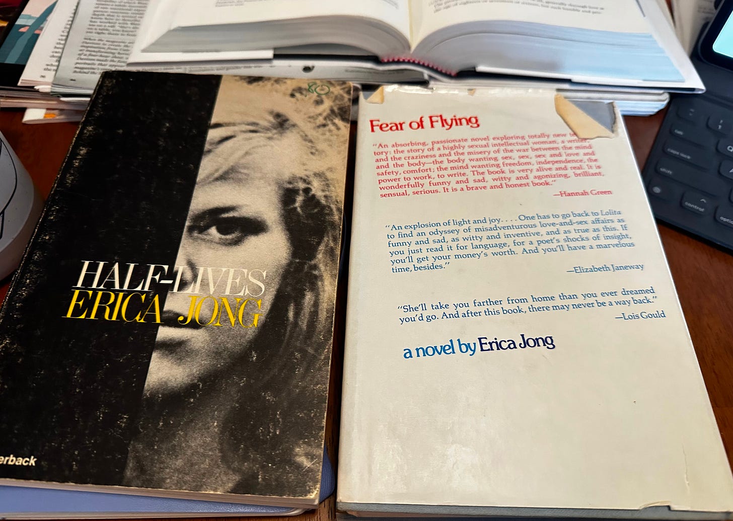 I randomly pulled my Fear of Flying book off the shelf today and was yet again delighted by Erica Jong, and the memory of how I felt back when I discovered Erica Jong. God, I loved when I first found this — my mom’s 1980 copy, the book jacket already peeling back at the corners even then, a paint swatch left inside that I assume she used as a bookmark. The book is mine now, because I took it off her shelf, which was no longer her shelf, and I put it on mine.